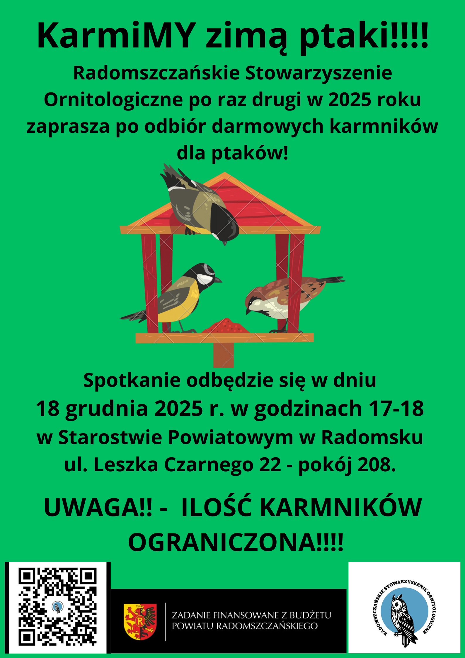 Radomszczańskie Stowarzyszenie Ornitologiczne po raz drugi w 2025 roku zaprasza mieszkańców do odbioru bezpłatnych karmników dla ptaków w ramach działań na rzecz ochrony i wspierania ptaków zimujących.