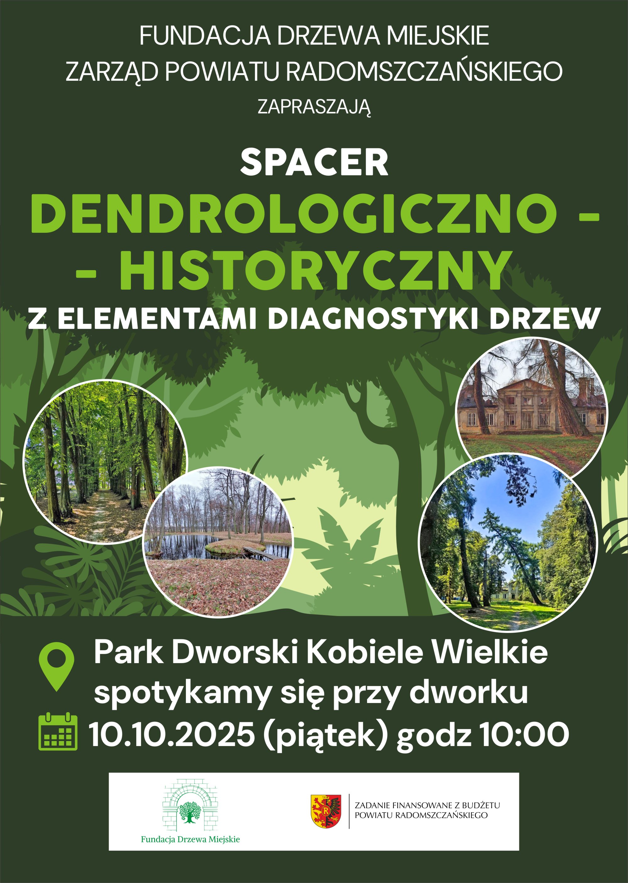 Fundacja Drzewa Miejskie zaprasza na wyjątkowy Spacer dendrologiczno-historyczny z elementami diagnostyki drzew, który odbędzie się 10 października 2025 r. (piątek) o godz. 10:00 w Parku Dworskim w Kobielach Wielkich.