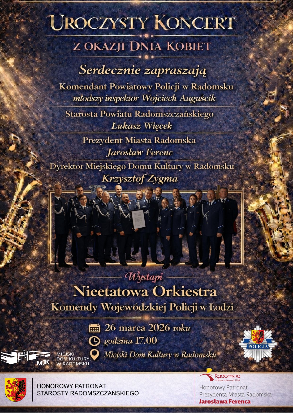 Na wydarzenie zapraszają: Komendant Powiatowy Policji w Radomsku, Starosta Powiatu Radomszczańskiego, Prezydent Miasta Radomska oraz Dyrektor Miejskiego Domu Kultury w Radomsku.