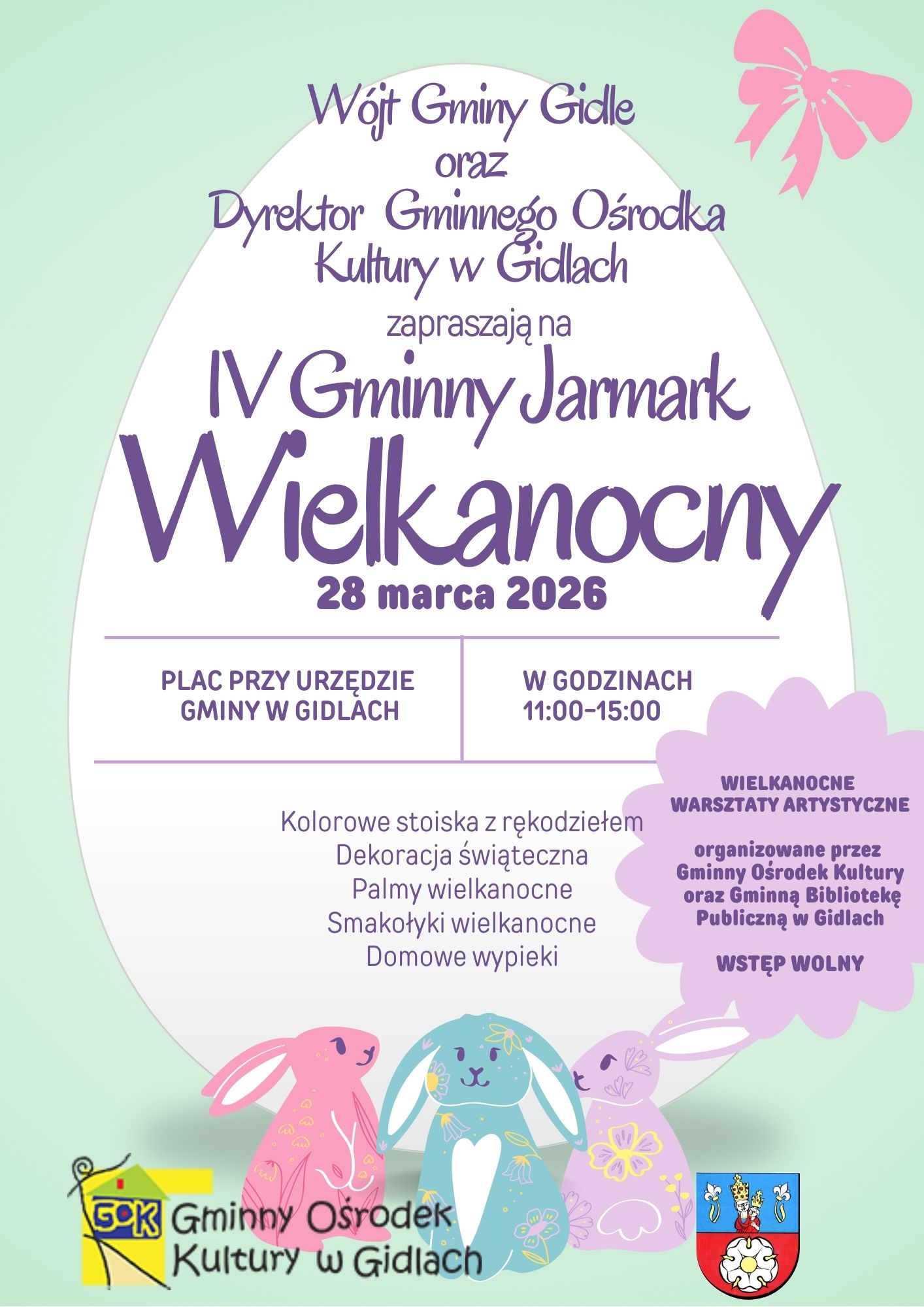 Jarmark odbędzie się w sobotę 28 marca 2026 na Placu przy Urzędzie Gminy w Gidlach w godzinach 11:00-15:00. To idealna okazja, by poczuć klimat nadchodzącej Wielkanocy oraz zaopatrzyć się w unikatowe, ręcznie wykonane ozdoby jak również tradycyjne, domowe smakołyki.