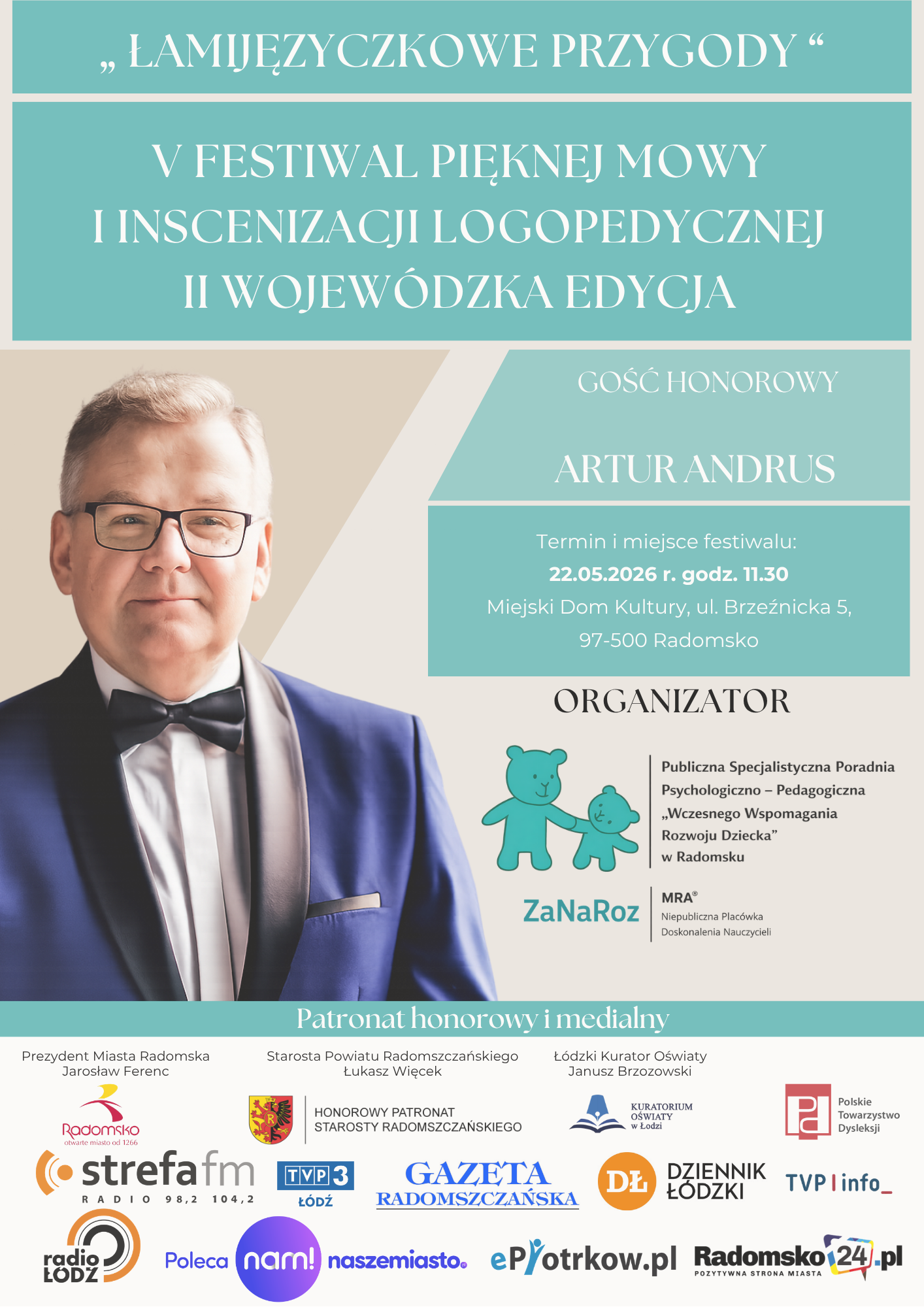 W Radomsku już wkrótce odbędzie się wyjątkowe wydarzenie skierowane do najmłodszych – V Festiwal Pięknej Mowy „Łamijęzyczkowe przygody”. Organizatorami przedsięwzięcia są Publiczna Specjalistyczna Poradnia Psychologiczno-Pedagogiczna „Wczesnego Wspomagania Rozwoju Dziecka” w Radomsku oraz Niepubliczna Placówka Doskonalenia Nauczycieli ZaNaRoz w Radomsku.